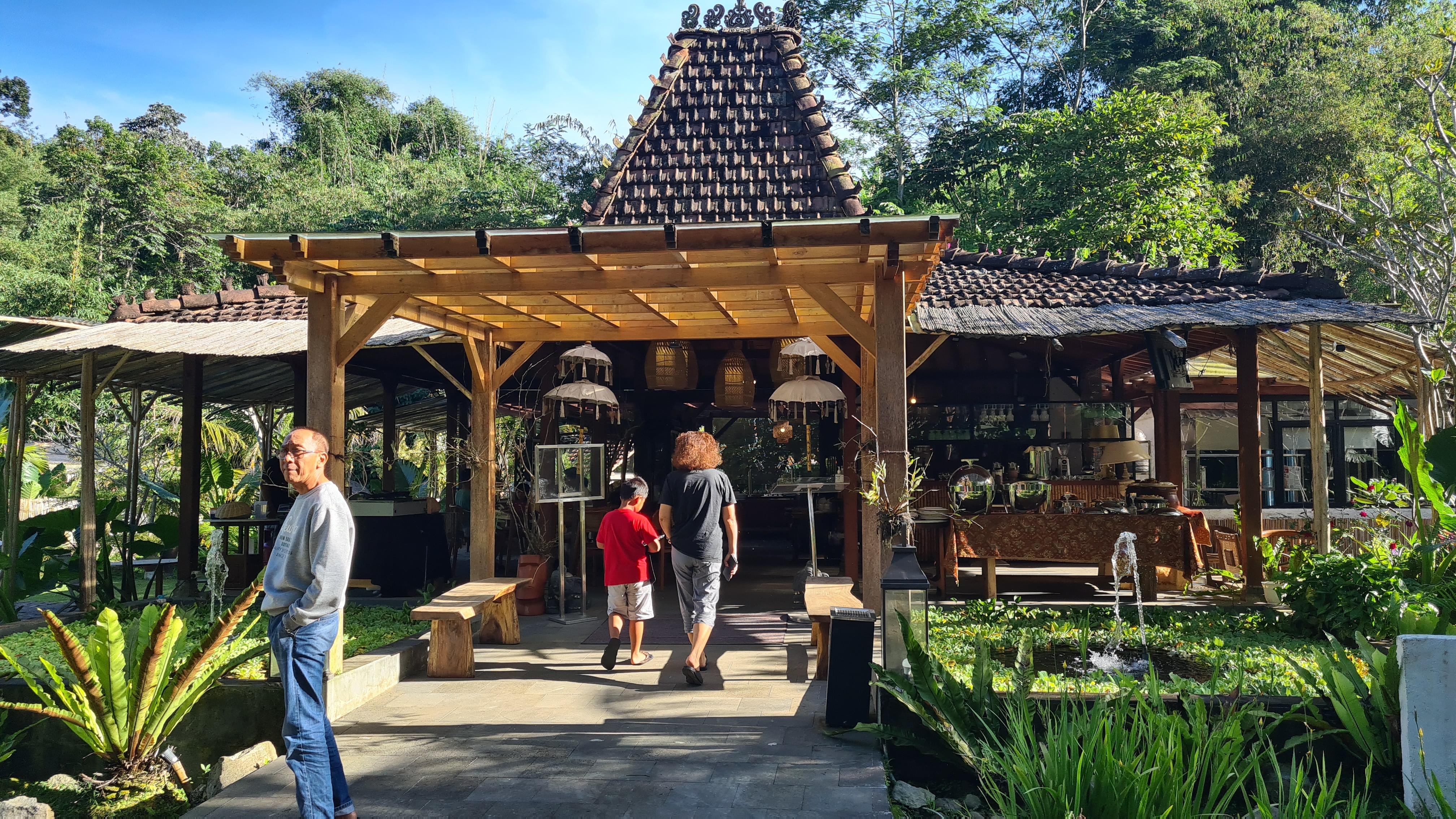 Harga kamar sudah termasuk sarapan, snack sore dan makan malam. Sarapan dilakukan di area resto di bawah, khusus untuk tamu resort. Makan malam bisa diantar ke kamar atau bisa juga di restoran di atas.