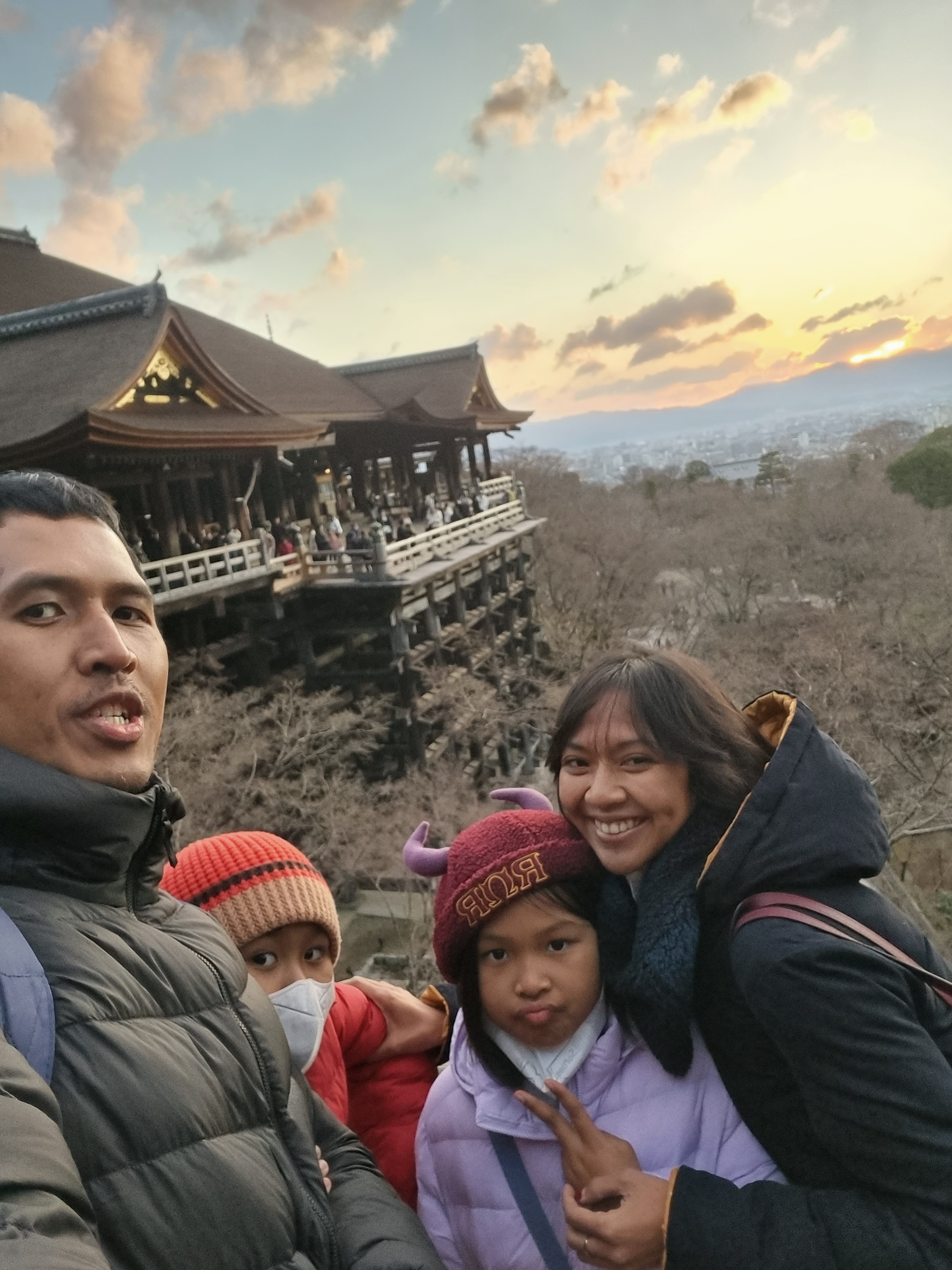 - Matahari terbenam di Kiyomizudera, Kyoto, Jepang 2023. Tripnya dadakan jadi itinerary juga dibuat detail dan sengaja mau ke sini lagi setelah terakhir di 2014 berdua sama Yukka. Ga sengaja juga datengnya sore karena kita paginya ke Kyoto Railway Museum dulu. Seneng banget nikmatin senjanya di sini walaupun buat gw dingin banget udaranya dan berangin. Tapi anak-anak dan suami yang badannya pada lebih tebel bisa menikmati, jadi ikut senyum. Karena lokasinya cukup di atas, maka mataharinya cantik dan jelas banget, bisa lihat kota Kyoto juga dari atas.