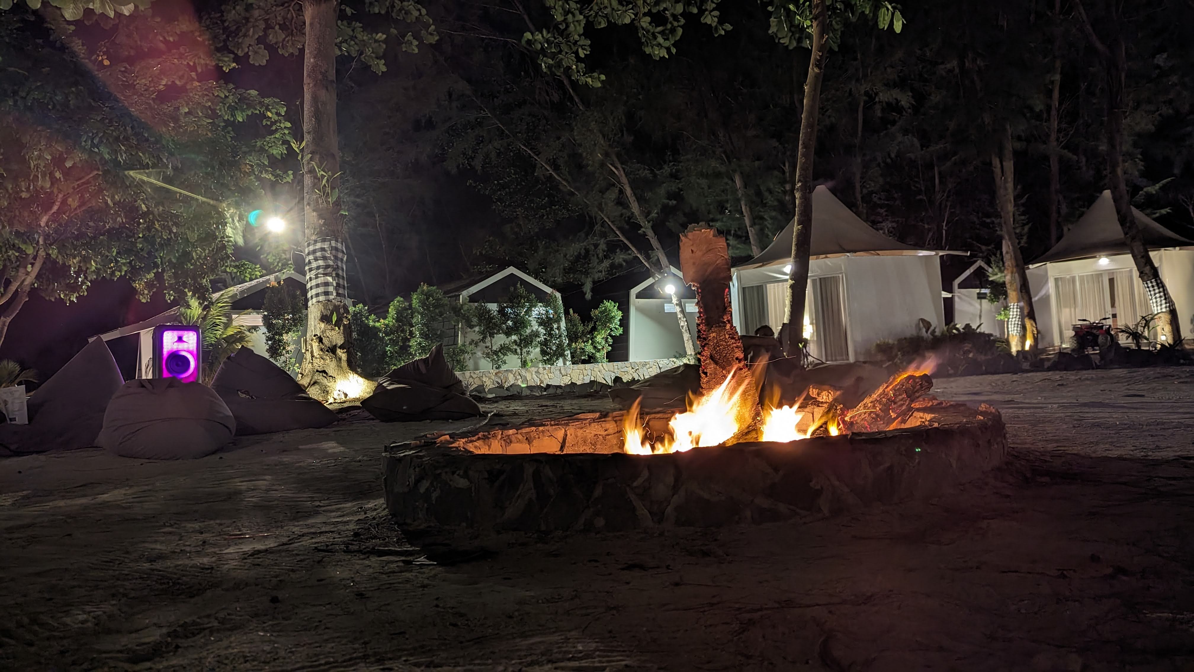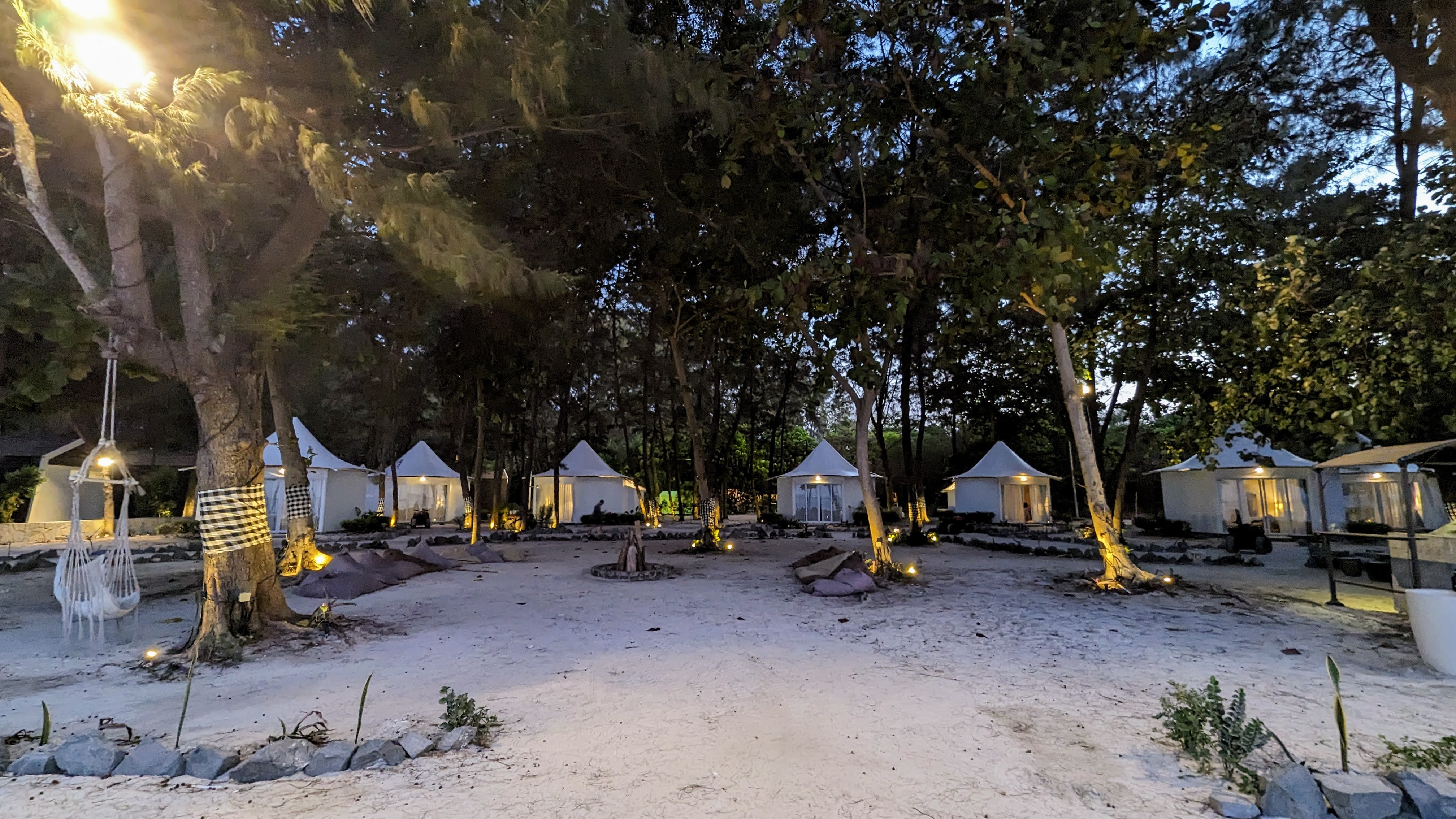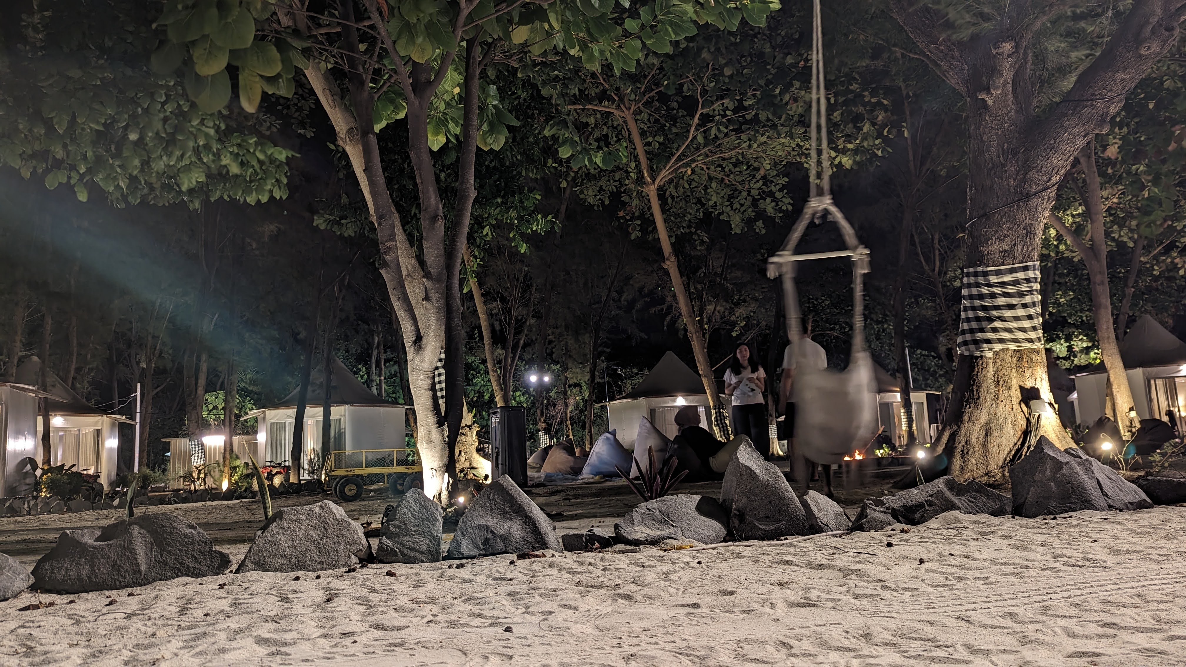 Area resort, kamarnya tenda tapi kategorinya ya glampinglah ya ini. Sempet hujan juga sekitar jam 4 pagi tapi tenda kita aman semua ga ada bocor. Kita pake 4 kamar untuk 13 orang, satu kamarnya kalo lebih dari 2 orang perlu extrabed. Ada area bersama di tengah2 antara kamar-kamar dan pantai, ada ayunan dan bean bag buat duduk ngerumpi. Malem-malem kita api unggun dan makan malam di sini, seru 🙂