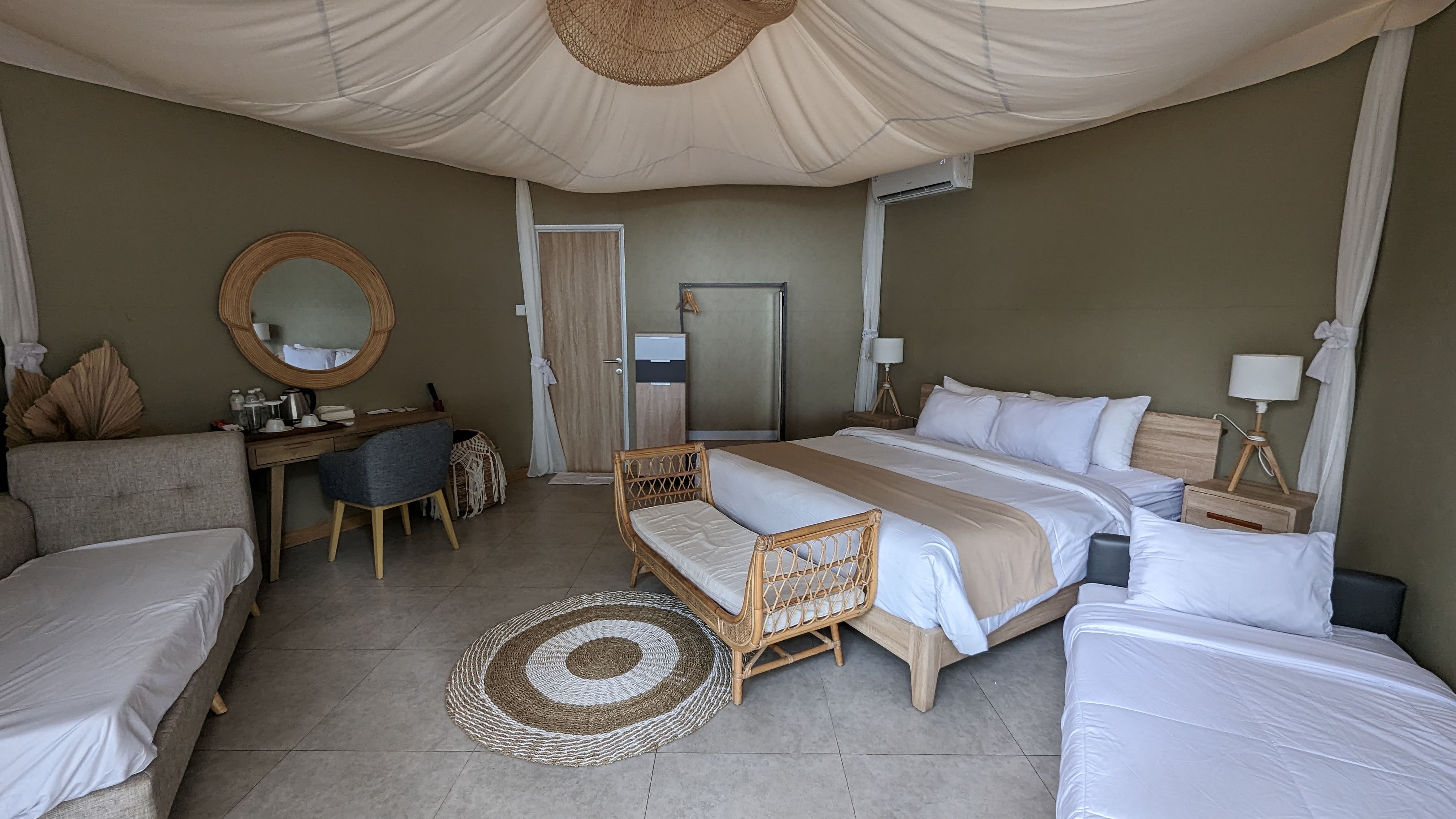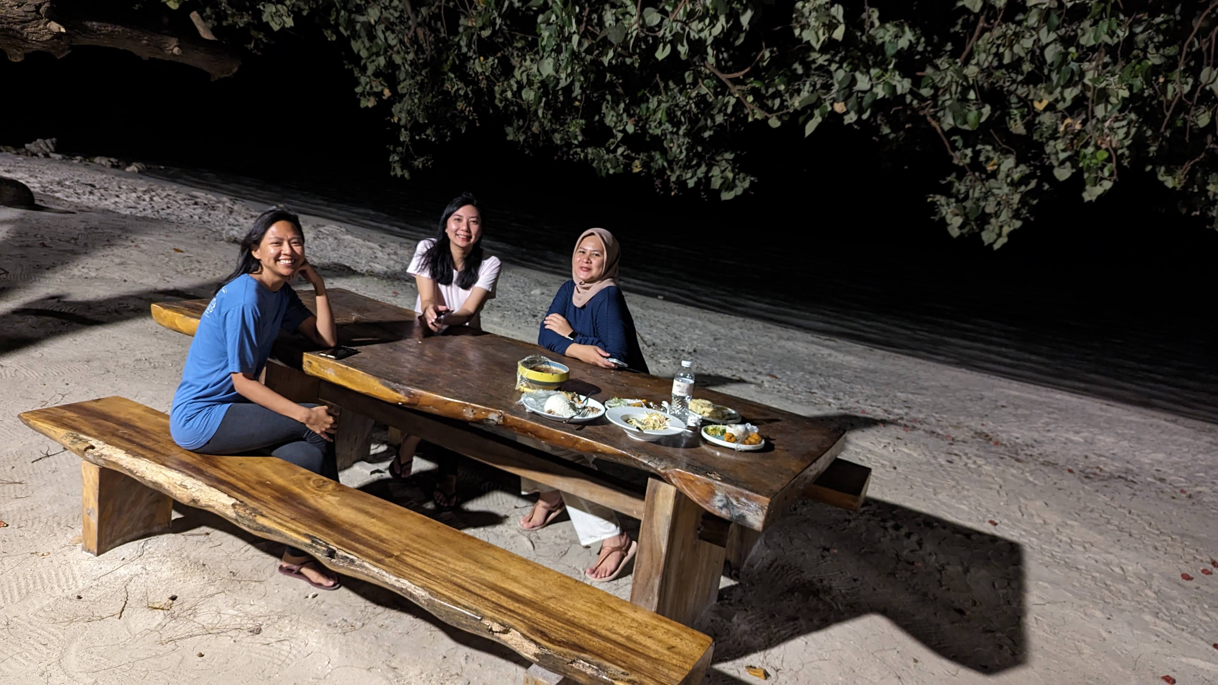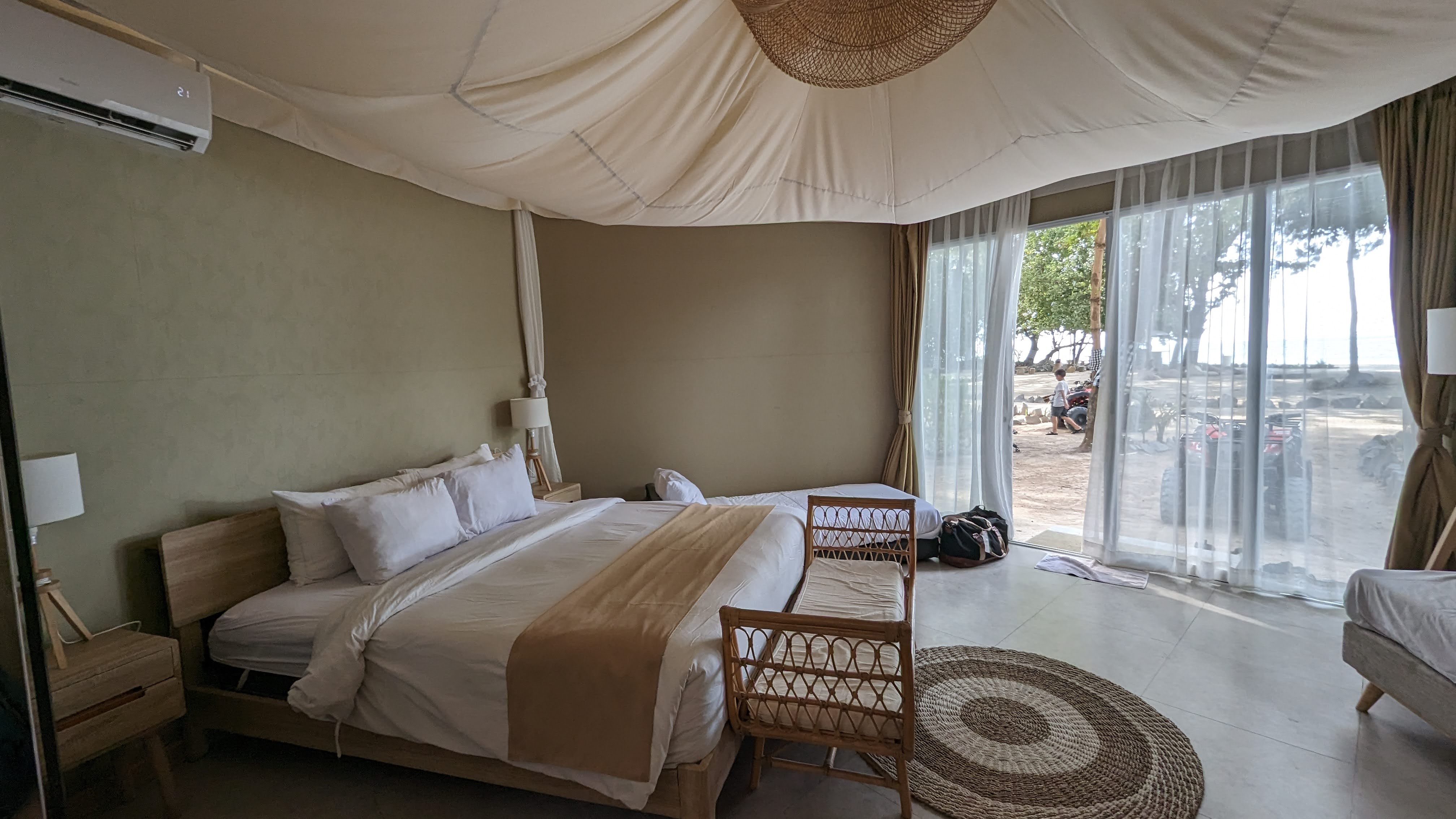 Area resort, kamarnya tenda tapi kategorinya ya glampinglah ya ini. Sempet hujan juga sekitar jam 4 pagi tapi tenda kita aman semua ga ada bocor. Kita pake 4 kamar untuk 13 orang, satu kamarnya kalo lebih dari 2 orang perlu extrabed. Ada area bersama di tengah2 antara kamar-kamar dan pantai, ada ayunan dan bean bag buat duduk ngerumpi. Malem-malem kita api unggun dan makan malam di sini, seru 🙂
